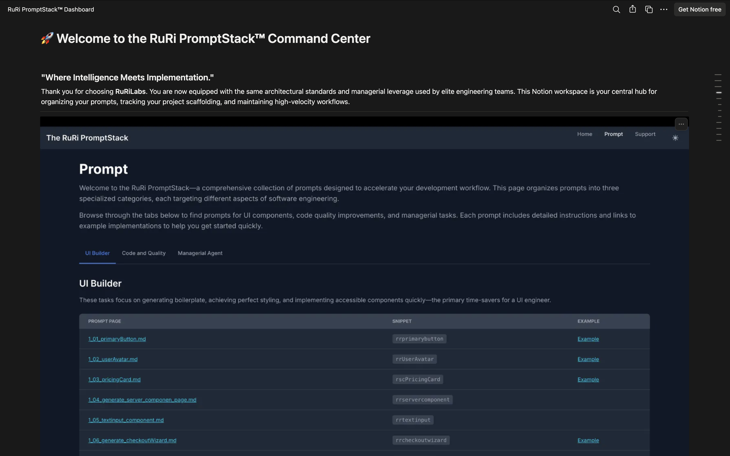 Code is only half the battle. The RuRi PromptStack™ Architect's Dashboard is a high-performance Notion workspace that centralizes your technical intelligence. It features a searchable Prompt Registry, a Project Scaffolding Tracker, and a Managerial Engine for high-stakes leadership tasks. Stop searching through folders and start leading with a unified command center.